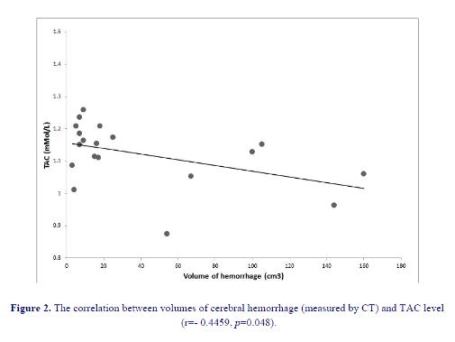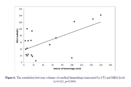 32). Among our 24 hemorrhagic patients 11 had lesion in putamen which is the most common location, 7 in thalamus, 1 had pontine lesion and 3 had lobar hemorrhage (1 in frontal, 2 in parietal lobe). No association between MDA levels or TAC and the location of ICH was observed. We found lesion volume to be significantly correlated with MDA levels and negatively correlated with TAC.