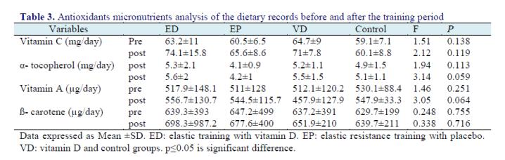 The results showed that there is no significant difference in antioxidant micronutrients among groups measured by food processor software. Antioxidant analysis results of the dietary records of all groups before and after the study period are presented in table 3.