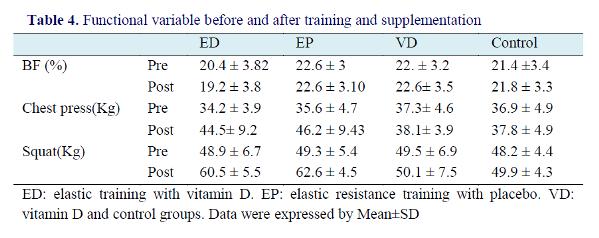 It is shown that the eight-week elastic resistance training alone or with vitamin D supplementation could not affect BF%. Fat tissue and its changes have an important role in cytokine resting levels (