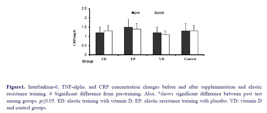 -1, and they are at moderate risk for cardiovascular disease. However, in the current study, neither elastic resistance training nor vitamin D supplementation has an effect on CRP. It seems that this issue may attribute lack of changes to BF%. The relation to body fat and its distribution is well known in the studies (