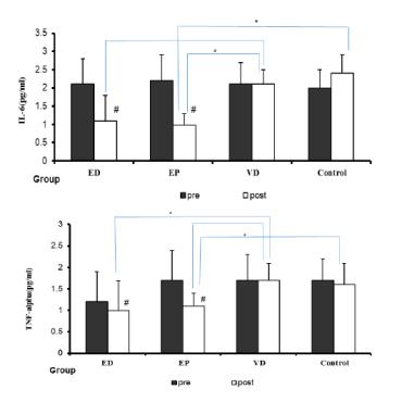 changes among the four groups after eight weeks of training. Bonferroni multiple comparison test showed that there was significant difference between ED with VD (p<0.05) and control (p<0.05) in IL6 and TNF-alpha. Also, Bonferroni test showed there is a significant difference in EP compared to VD (p<0.05) and control (p<0.05) in mentioned variables. However, it was observed that there is no significant difference between ED and EP in the abovementioned variables (p<0.05). Moreover, the results showed that there is no statistical significance in CRP concentration between pre- and post-training (p>0.05), leading to no statistically significant difference in CRP concentration (p>0.05). See figure 1.