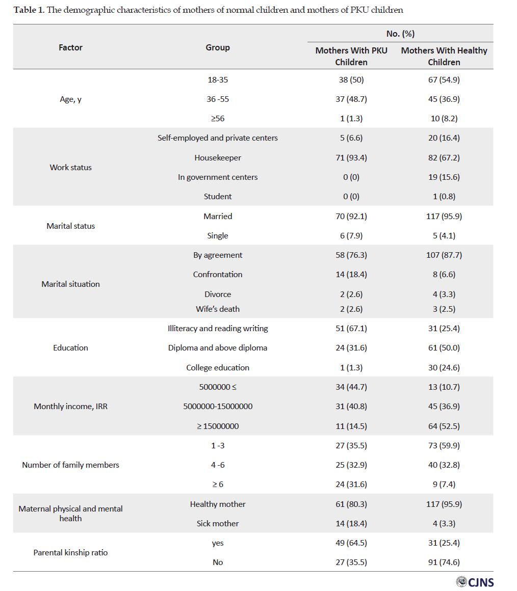 The Chi-square test was used to compare the demographic characteristics between the two groups of mothers with PKU and normal children. The results of this test showed no statistically significant difference between the two groups in terms of age (P =0.05), marital status (P =0.20), and marital life status (P =0.08). Therefore, the two groups were homogeneous in terms of these demographic characteristics of mothers and adjusted scores.