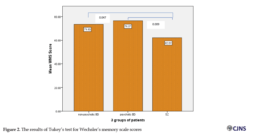 The results of ANOVA showed that the Mean±SD of the WMS sores in three groups of SZ, BD with psychosis, and BD without psychosis patients were 62.07 (10.75), 76.57 (12.62), 73.5 (13.31), respectively. Based on the results, there was a statistically significant difference between the mean of the WMS scores in the three groups of patients (F=5.42, P=0.008).