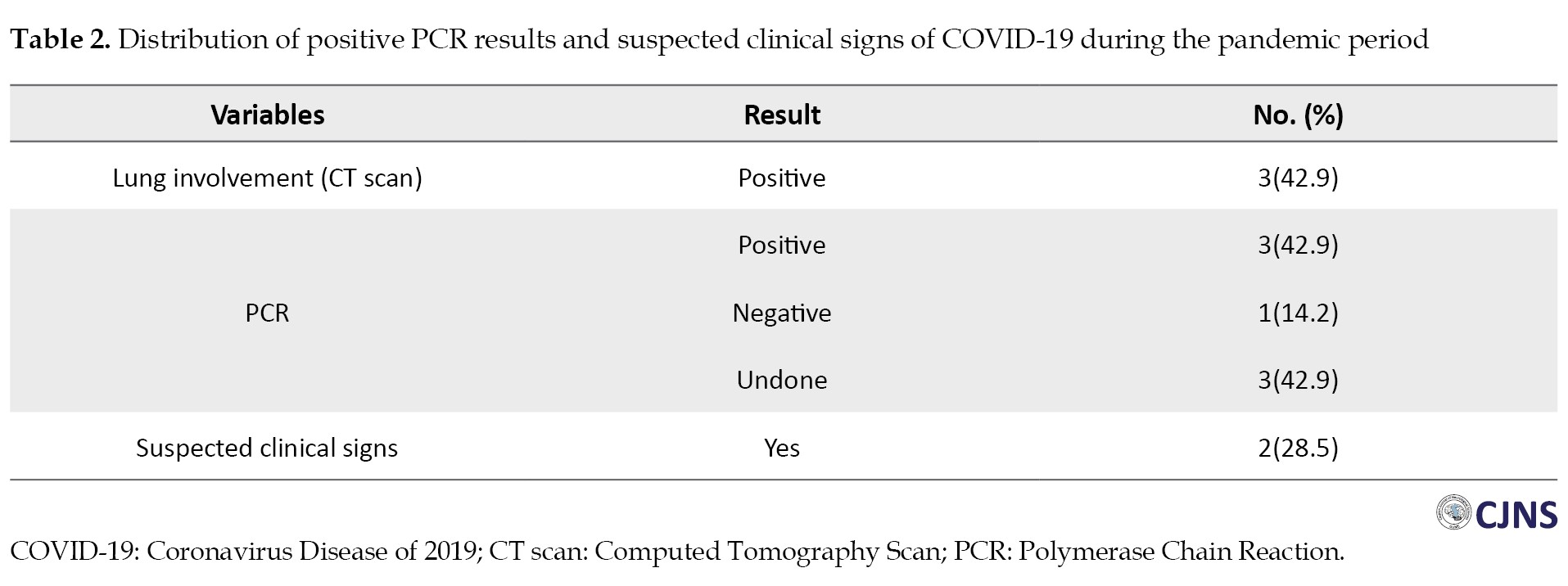 The GBS was found in 7 cases out of 2252 patients (0.3%), and 14 cases out of 3088 patients (0.4%) admitted to the neurology ward during the COVID-19 pandemic and before the pandemic, respectively. There was no significant difference between the distribution of GBS patients in the pandemic and before the pandemic (P=0.413).