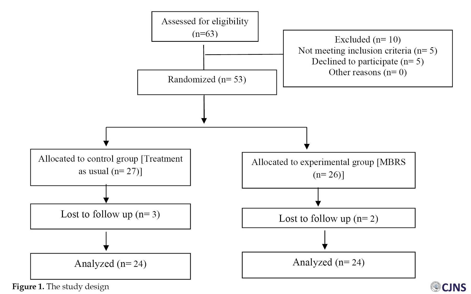 Among the patients visiting Ahwaz MS Clinic and signing the consent form, 48 available patients were selected to participate in the briefing, which provided a general explanation of the research procedure and treatment. Then, the patients were randomly allocated to two groups (intervention and control). They were assigned by permuted block random allocation, and each block included 4 participants. During the treatment period, no intervention was applied to the control group. Both groups completed the study questionnaires before, right after, and two months after the treatment period.
