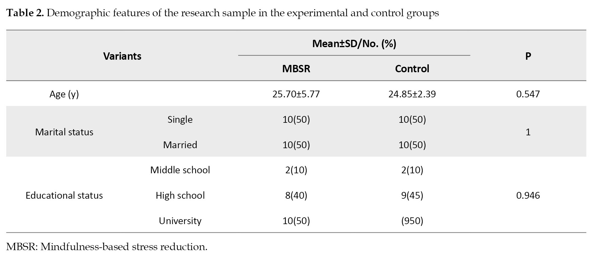 The chi-square test results show that the two groups are homogeneous regarding marital and educational status. Also, the subjects’ Mean±SD ages are provided for MBSR (25.70±5.77 year) and control groups (24.85±2.39 year). The t-test for the independent samples showed no significant differences between 2 groups (P=0.547).