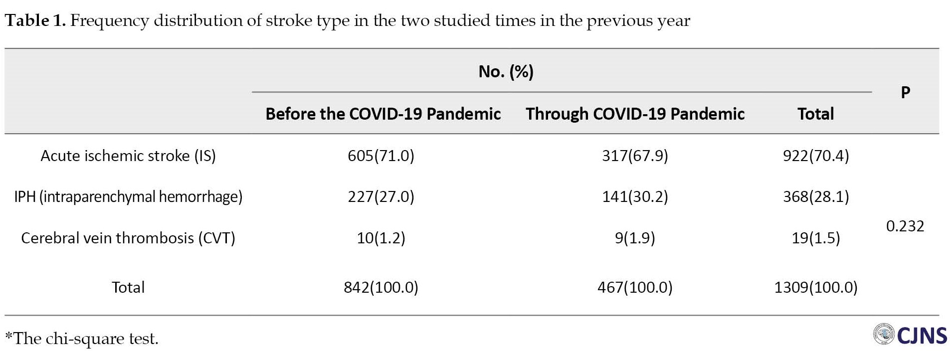 According to the results, 70.4%, 28.1%, and 1.5% of all patients were IS, IPH, and cerebral venous thrombosis (CVT), respectively. The frequency of admission of stroke patients through the SARS-CoV-2 pandemic was 67.9% for IS, 30.2% for IPH, and 1.9% for CVT, while these percentages were 71.9%, 27%, and 1.2% in a similar period in the prior year, respectively. The comparison between the percentages of IS, IPH, and CVT admission patients in two study periods based on the chi-square test was not significant (P=0.232). Furthermore, the ratio of stroke IS to stroke IPH declined from 2.6 in the corresponding period in the previous year to 2.2 during the SARS-CoV-2 pandemic period (