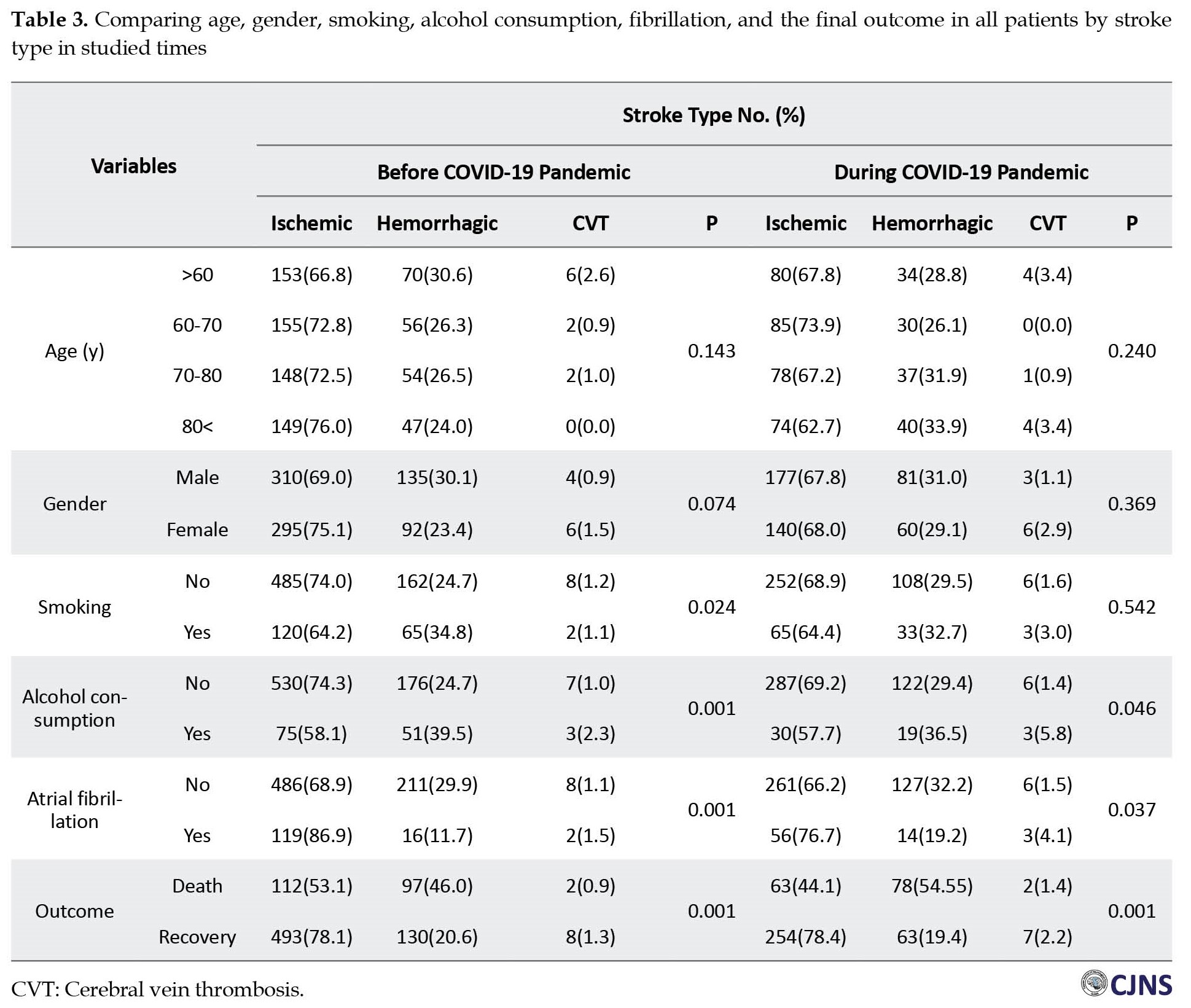 Alcohol consumption was associated with the frequency of IPH in both periods (P<0.05). The frequency of atrial fibrillation had a significant difference between IS, IPH, and CVT patients in both study times, including the COVID-19 pandemic period (P=0.037) and the similar period in the previous year (P<0.001). Furthermore, we found that CVT incidence among patients with atrial fibrillation comorbidity was 4.1% compared with patients without atrial fibrillation (1.5%) during the COVID-19 pandemic.