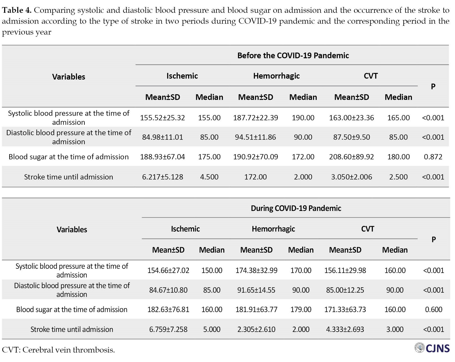 Table 4, the IPH patients showed higher systolic and diastolic blood pressure (at admission time) compared with patients suffering from IS stroke and CVT in both study periods (P<0.001).