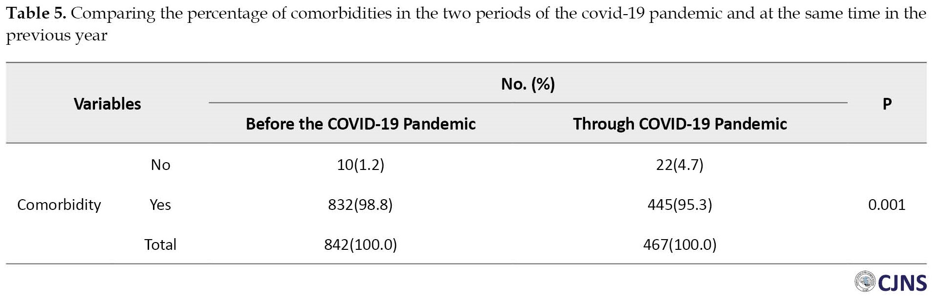 Table 5, the percentage of comorbidities during the COVID-19 pandemic was 95.3%, while it was recorded at 98.8% in the corresponding period in the previous year.