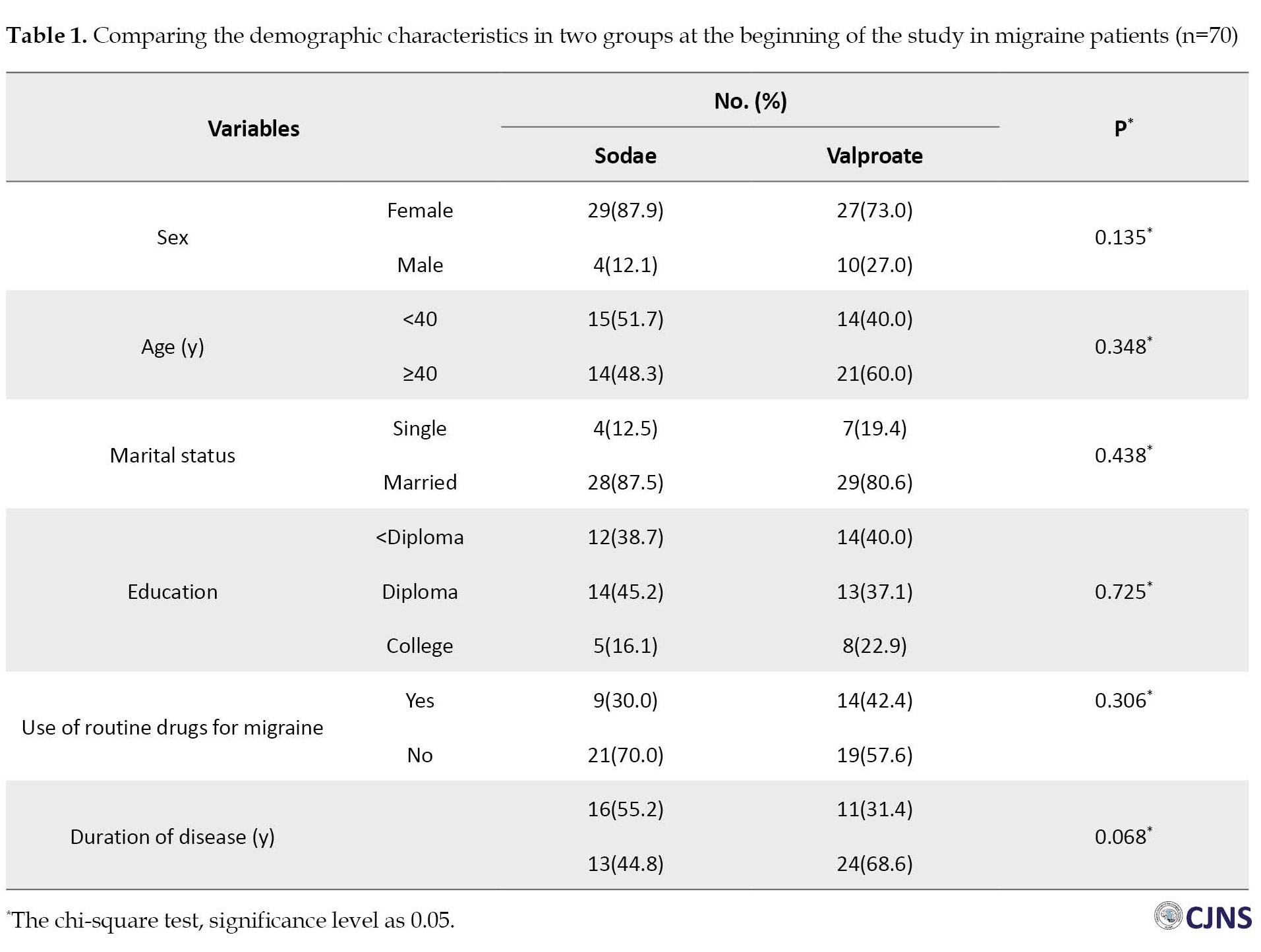 In this study, 70 migraine patients were evaluated, including 56 women (80%) and 14 men (20%). The sodae group consisted of 33 participants (47%), while the valproate group consisted of 37 participants (53%). For the sodae group, the Mean±SD age and duration of the disease were 40.77(11.2) and 7.27(8.9) years, and for the valproate group, it was 40.48(12.2) and 9.62(8.7) years, respectively. Demographic characteristics did not differ significantly between the sodae and valproate (