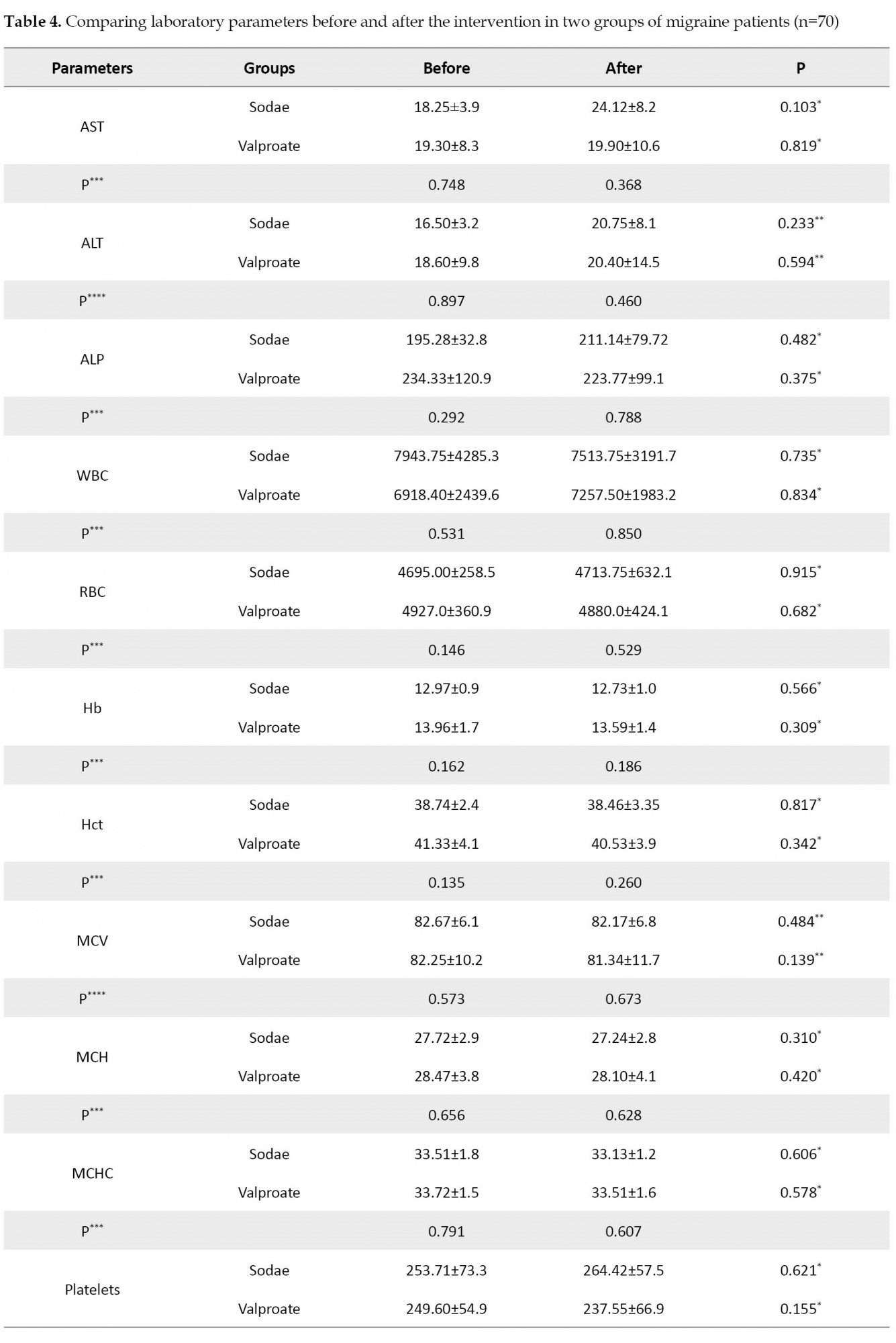 In both the sodae and valproate groups, liver enzymes and blood count did not significantly change after the study compared to before. Sodium valproate has been shown to influence laboratory parameters in studies [