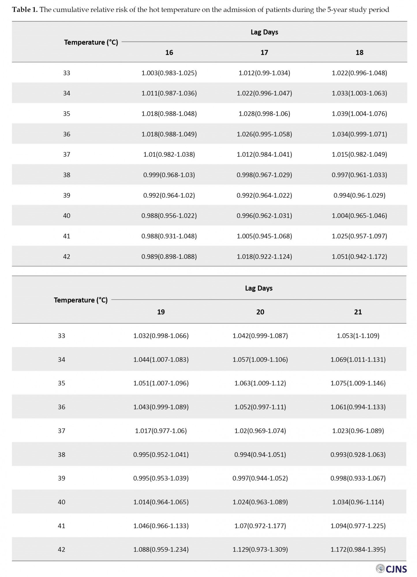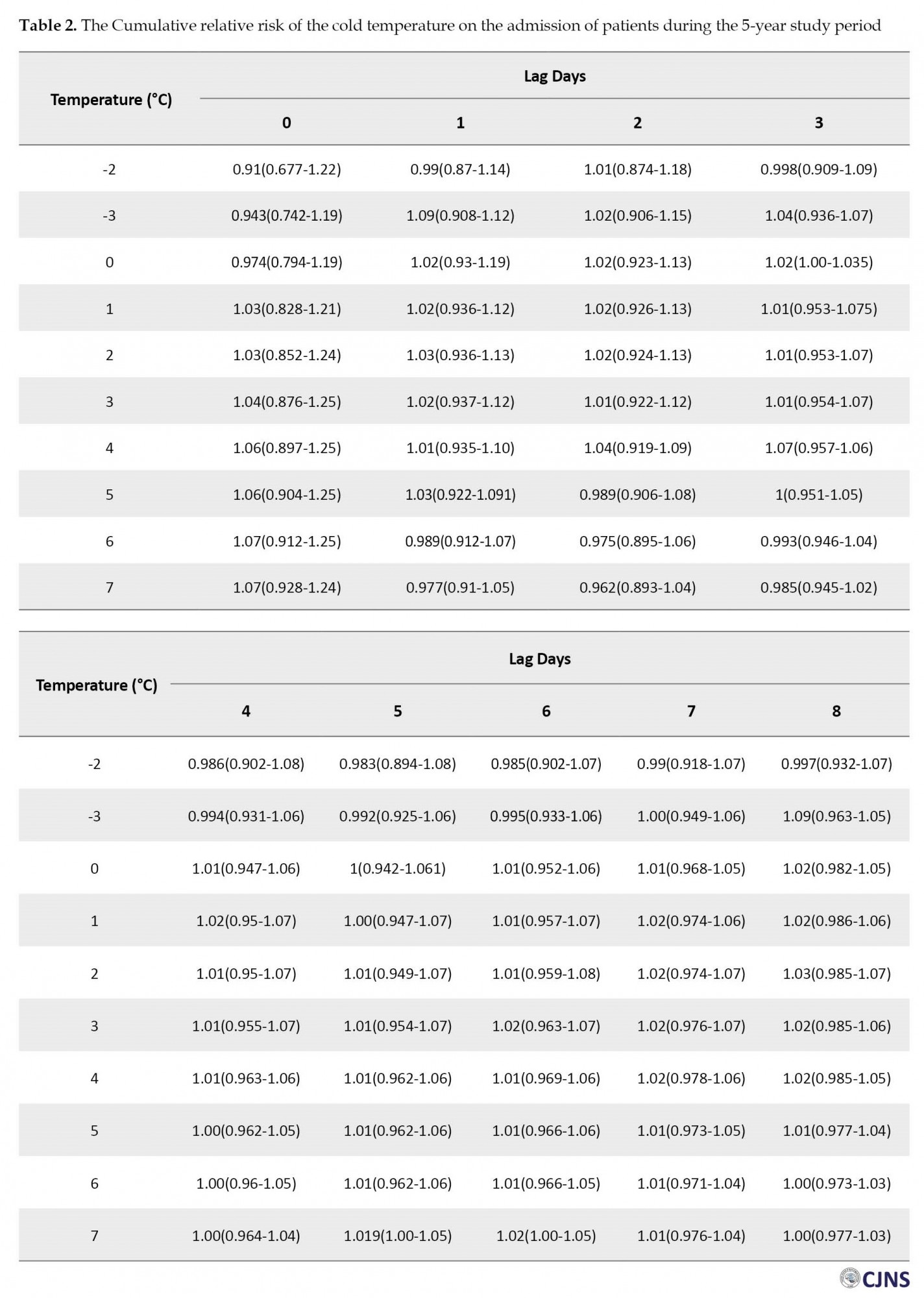 To determine the effect of hot temperature and to calculate the relative risk of this temperature, the 95th percentile of temperature was compared with that of the 75th percentile. To assess the impact of cold temperature and to calculate the relative risk of this temperature, the first temperature percentile was compared with the 25th percentile. According to a 5-year study in Rasht, the average humidity was 83%, so this number was calculated as a baseline, and the relative risk of increasing and decreasing humidity was compared with this figure. Given the effect of atmospheric pressure on cerebrovascular events of patients and the average atmospheric pressure over 5 years in Rasht (1017 hPa), changes in atmospheric pressure were compared with the average, and relative risk was calculated. Since the impact of metrological variables has lag effects, this study investigated for 21 days.
