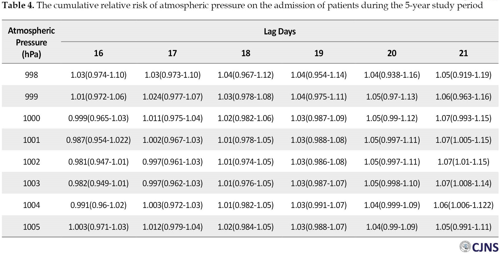 The effect of low atmospheric pressures on stroke admission in lag days 16-21 showed that pressures of 1001, 1002, 1003, and 1004 hPa, 21 days after exposure were associated with the risk of stroke (RR=1.075; 95% CI, 1.005%-1.15%) (RR=1.076; 95% CI, 1.007%-1.15%) (RR=1.072; 95% CI, 1.008%-1.14%) (RR=1.062; 95% CI, 1.006%-1.122%) respectively, as presented in detail in