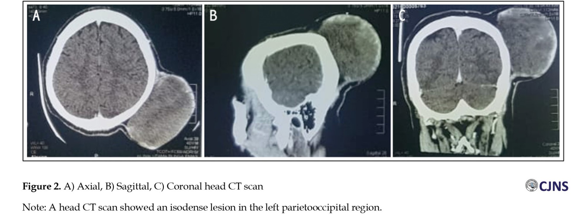 A computed tomography (CT) scan of the head was conducted to assess the mass. The results showed an isodense, non-enhancing mass outside the skull on the left occipital, measuring 12×10×8 cm in size (
