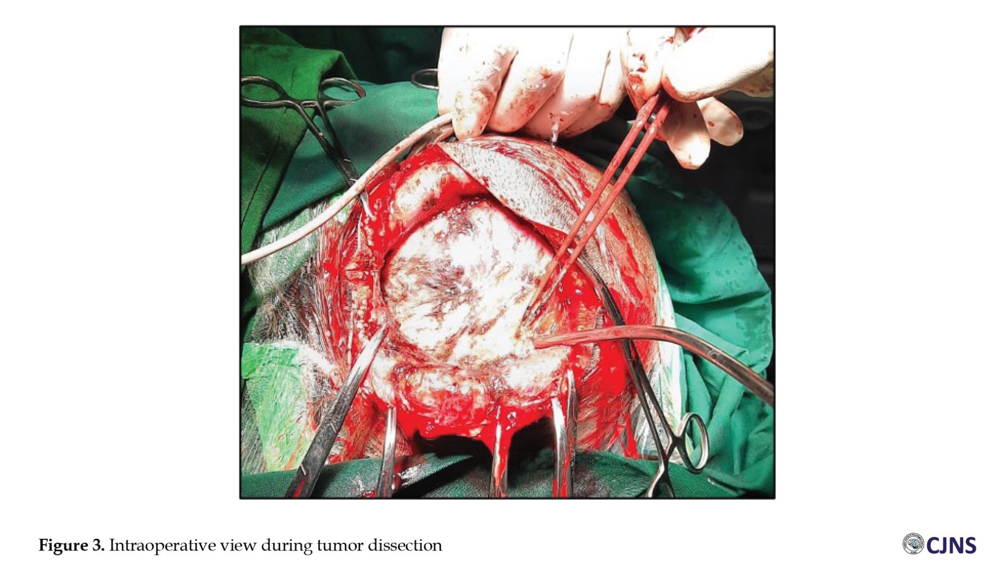 24]. We were using an elliptical surgical incision, identifying the tumor around 15 mm from the skin and meticulously dissecting the tumor from the surrounding tissue. The main feeder artery was from the left occipital artery, which was identified early in the surgery and then coagulated. This early identification assists during the surgery, which helps minimize blood loss. We were using blunt dissection to separate the tumor from the surrounding structure. The base of the tumor is located just above the periosteum (