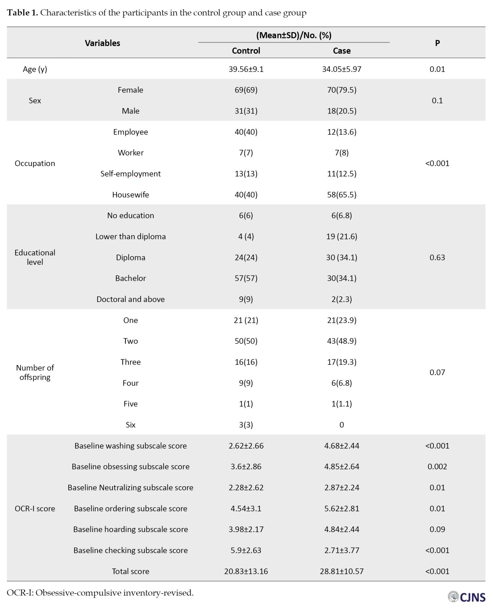 15]. The Persian version of the OCI-R was used in this study to assess various domains of OCD symptoms. This instrument consisted of six components: “Washing,” “obsessing,” “neutralizing,” “ordering,” “hoarding” and finally “checking,” each of which consisted of three items. Using a 5-point Likert scale, 18 items were rated from 0 (no distress) to 4 (extreme distress). A score of 21 or more points to the presence of OCD. There was a range of 0 to 72 in the total score. The validity of this questionnaire was determined by comparison with the Maudsley obsessive-compulsive inventory (MOCI), whose Pearson correlation coefficient was 0.61 to 0.75 for all the scales and subscales. A test re-test method was used to evaluate the reliability of the questionnaire, and the results ranged from 0.77 to 0.97 [