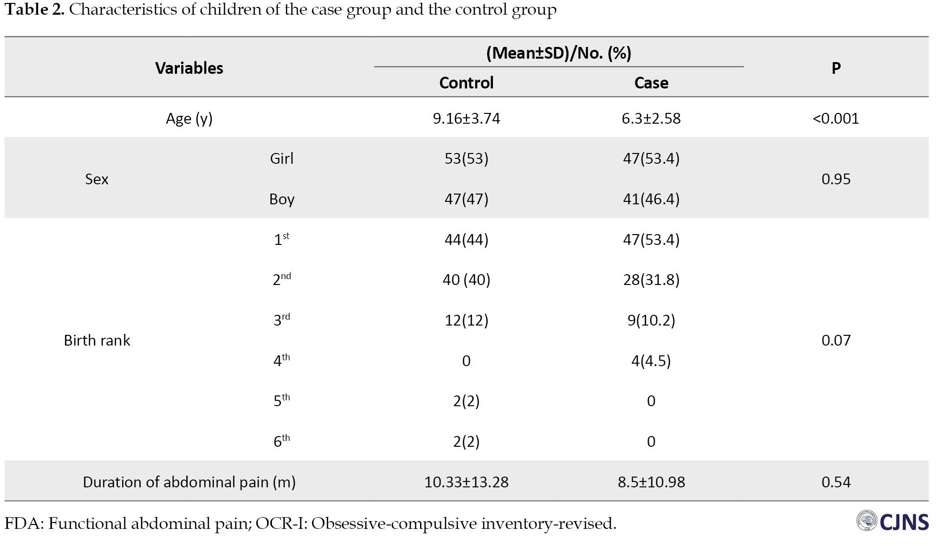 There was a significant difference in age between the case and control children (P<0.001); the mean age of the FAP children was 6.3±2.58 years, and the mean age of the controls was 9.16±3.74 years. Moreover, there were no significant differences in birth rank, gender composition, and also duration of abdominal pain between the children of the cases and controls.