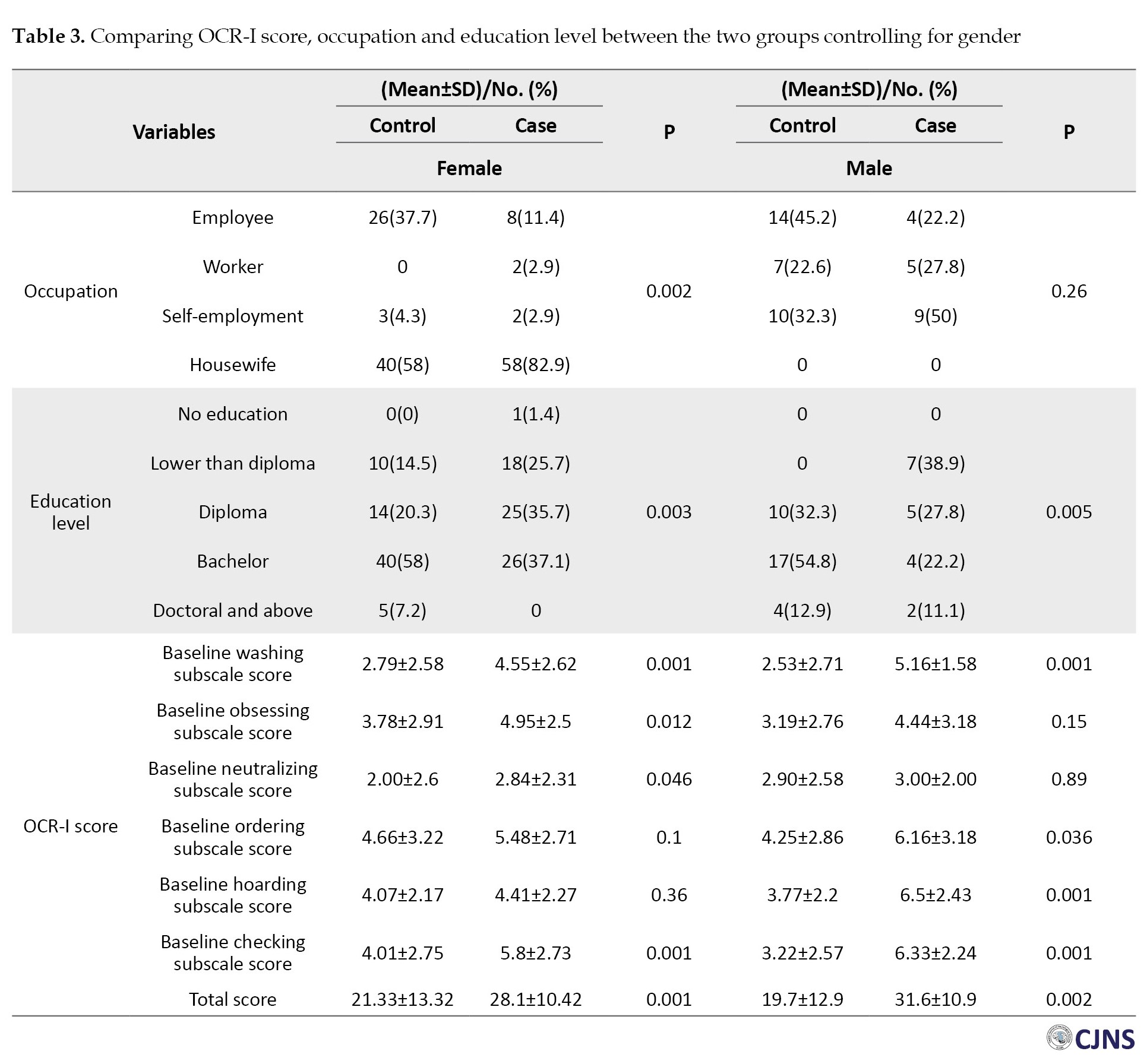 The baseline total OCR-I score was significantly greater in the case group than in the control group (28.81±10.57 vs 20.83±13.16; P<0.001). The baseline scores for washing, obsessing, neutralizing, ordering, and checking subscale scores were substantially higher in the cases than in the controls. The baseline hoarding subscale score did not significantly differ across cases and controls (P=0.09). A comparison of patient characteristics and OCR-I scores after controlling for gender is also presented in