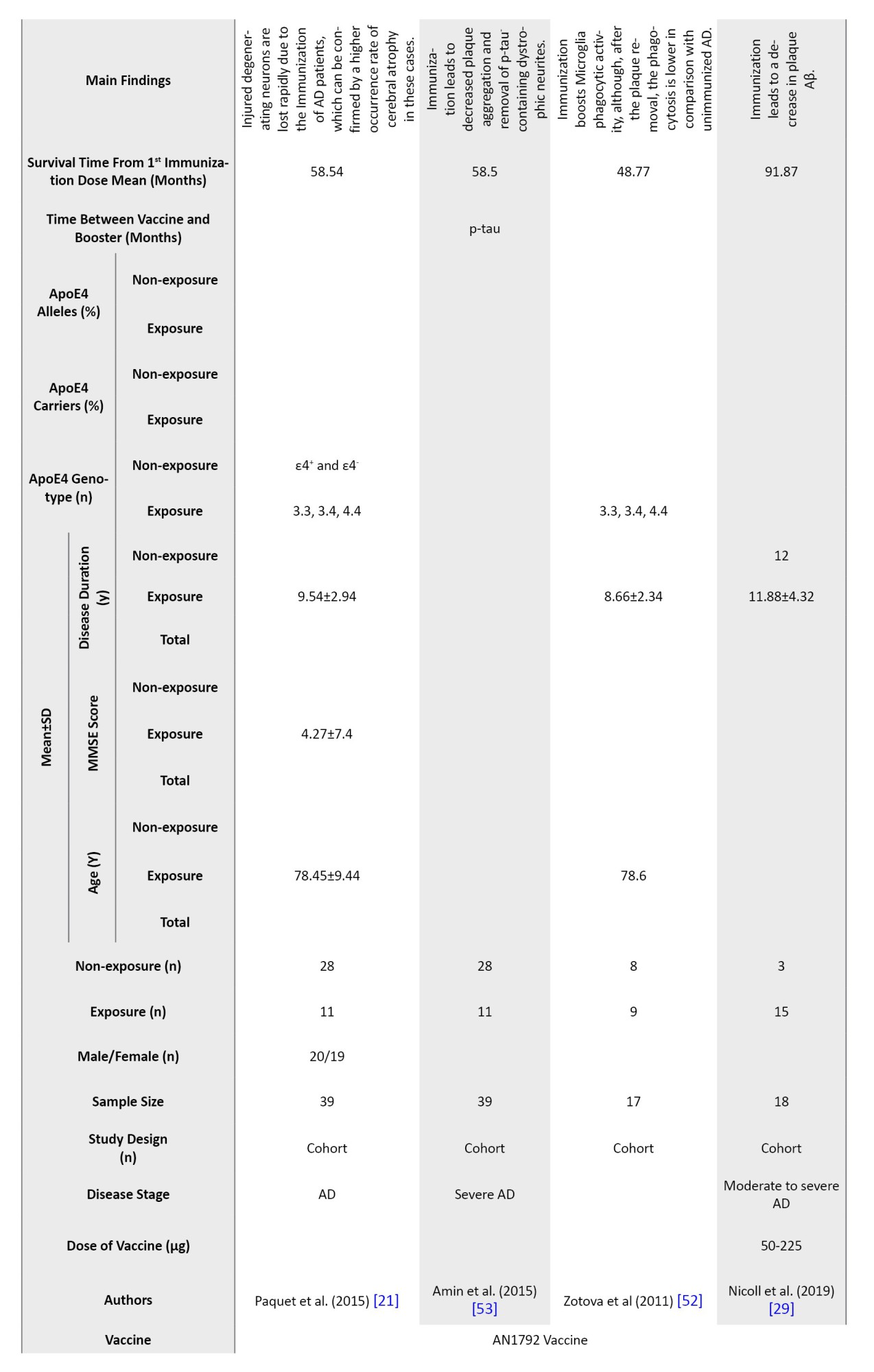 Most immunotherapies and vaccinations target Aβ to trigger a suitable immune response (anti-Aβ antibodies) that removes the Aβ deposits and enhances cognitive and functional capacities. AN1792 was the first vaccine used for active immunotherapy in AD, and it was used in 26 out of 29 studies we reviewed. AN-1792 includes aggregated human Aβ42 combined with a saponin-based adjuvant QS-21. The safety and tolerability of this vaccine were first demonstrated in a phase I study. Anti-Aβ42 antibodies from AN1792 recipients could distinguish between Aβ plaques located extracellularly and those in brain blood vessels [
