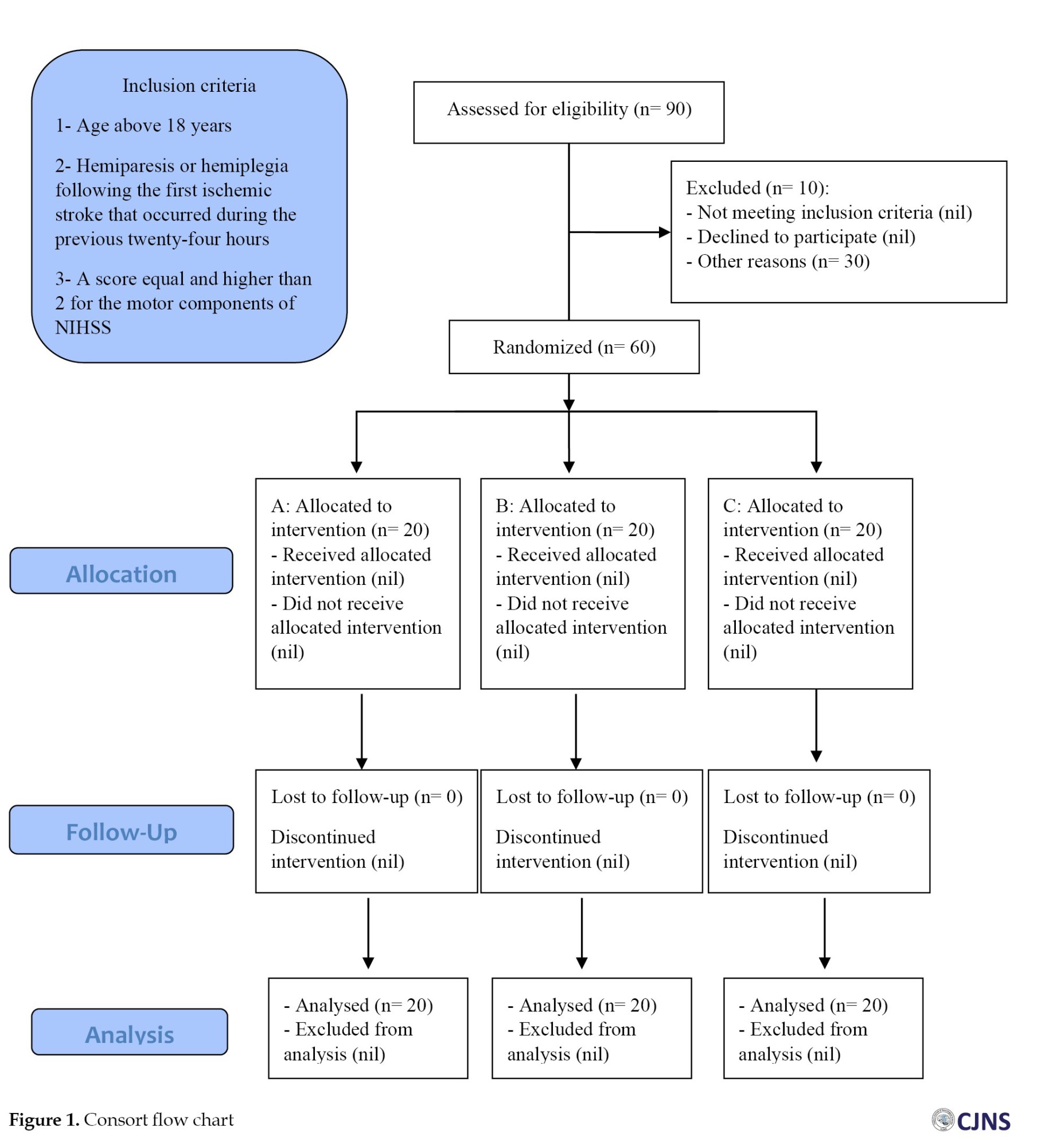 23]. This scale has 11 components (for each item, scores range from 0 to 4). A score of 0 on each item indicates normal performance in that ability, whereas a score of 1 or more shows impairment. This scale was used to evaluate the motor score of the upper and lower limbs on the first, 30th, 60th and 90th days. In this study, the researcher assessed the NIHSS criterion without blinding himself or herself to the treatment allocation.