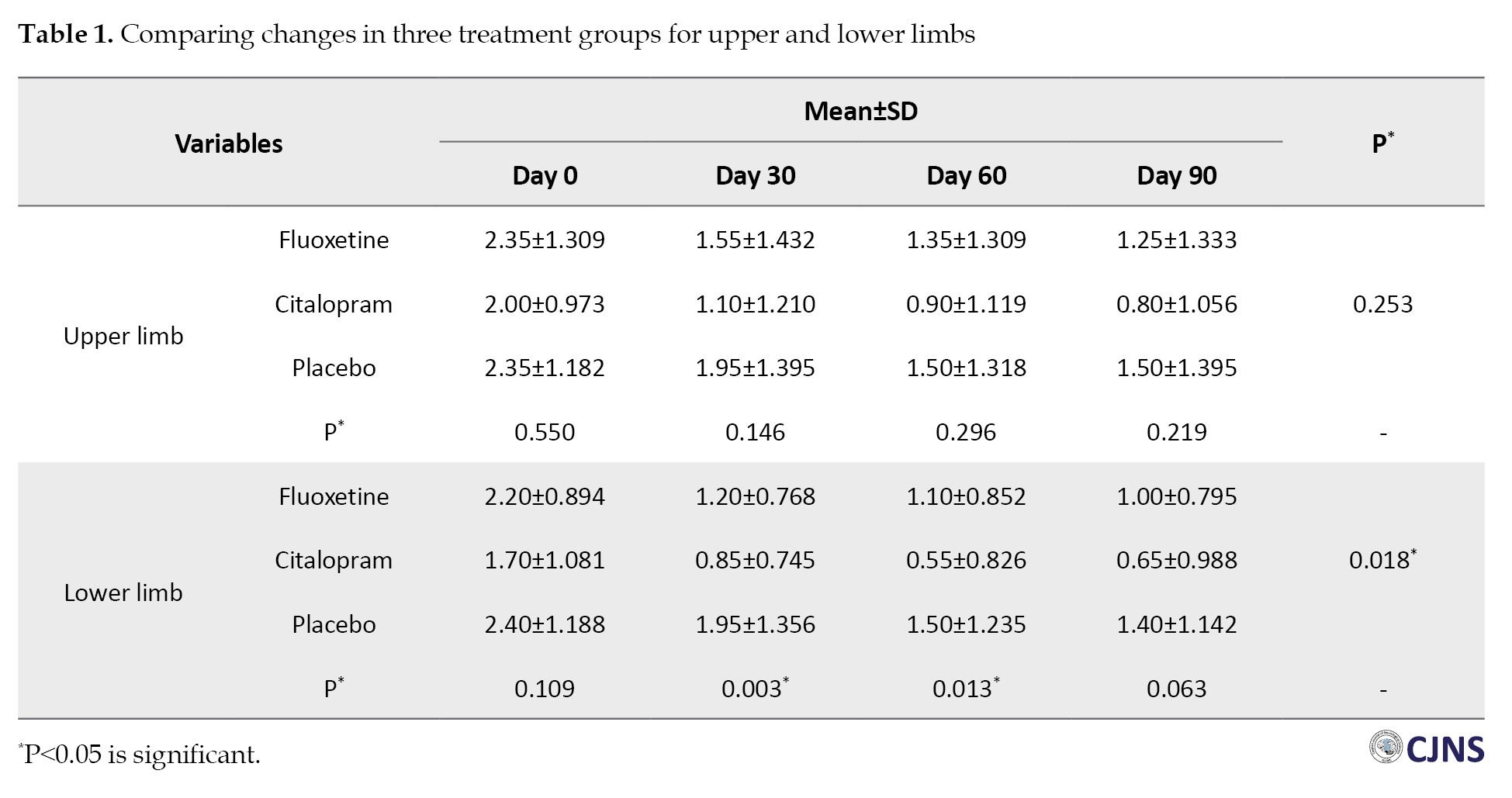 In addition, citalopram, like fluoxetine, was effective on patients’ mobility status at the beginning of the research compared to all other times (P<0.001). Also, considering we used the minimum therapeutic doses of citalopram and fluoxetine, the studied patients had no side effects.