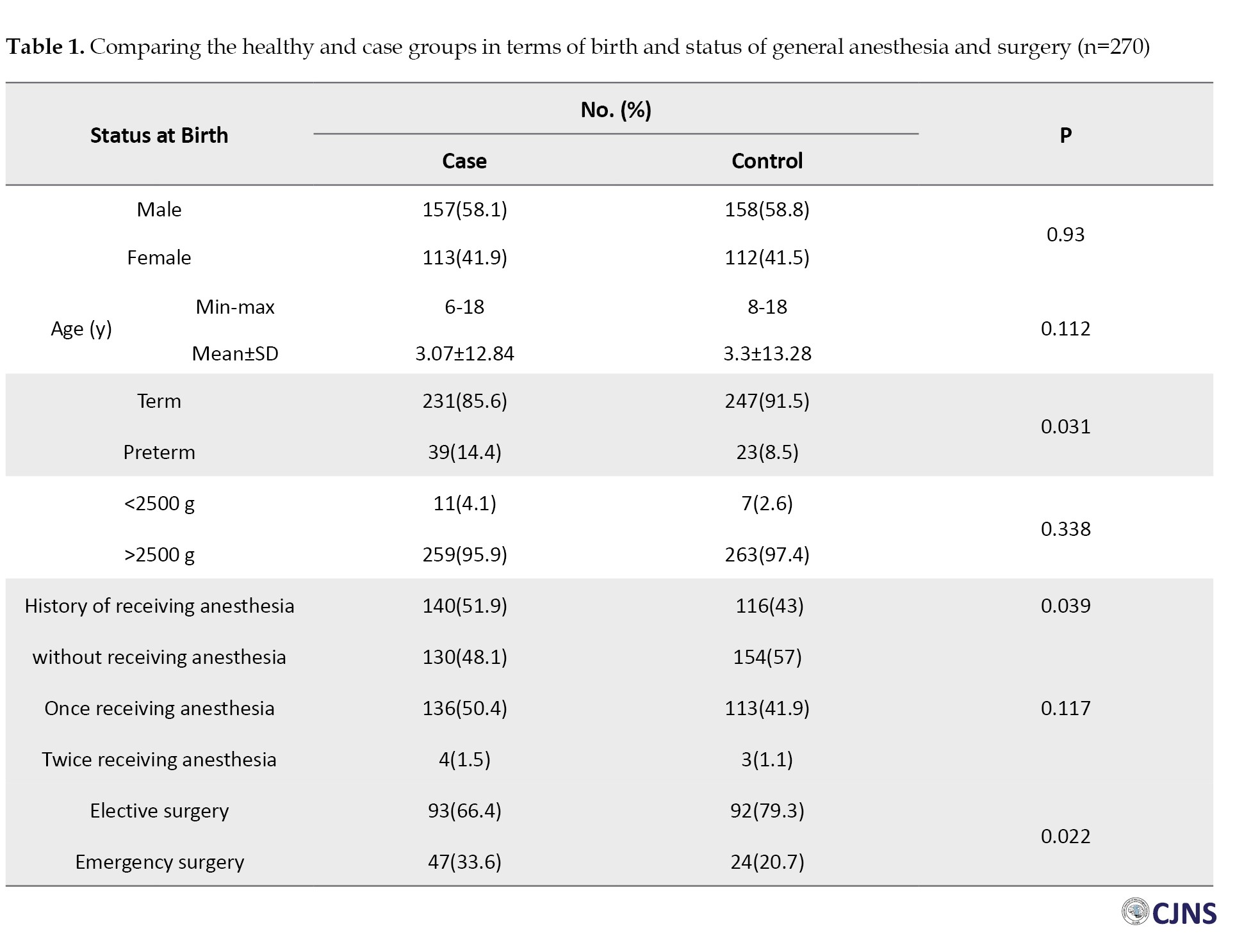 The data of 540 cases and controls were analyzed. Comparing the two groups, a significant difference was observed in terms of birth status (term/preterm) (P=0.031), history of receiving anesthesia under 4 years (P=0.039), age of receiving anesthesia (P=0.021), and type of surgery requiring anesthesia (elective/emergency) (P=0.022) (