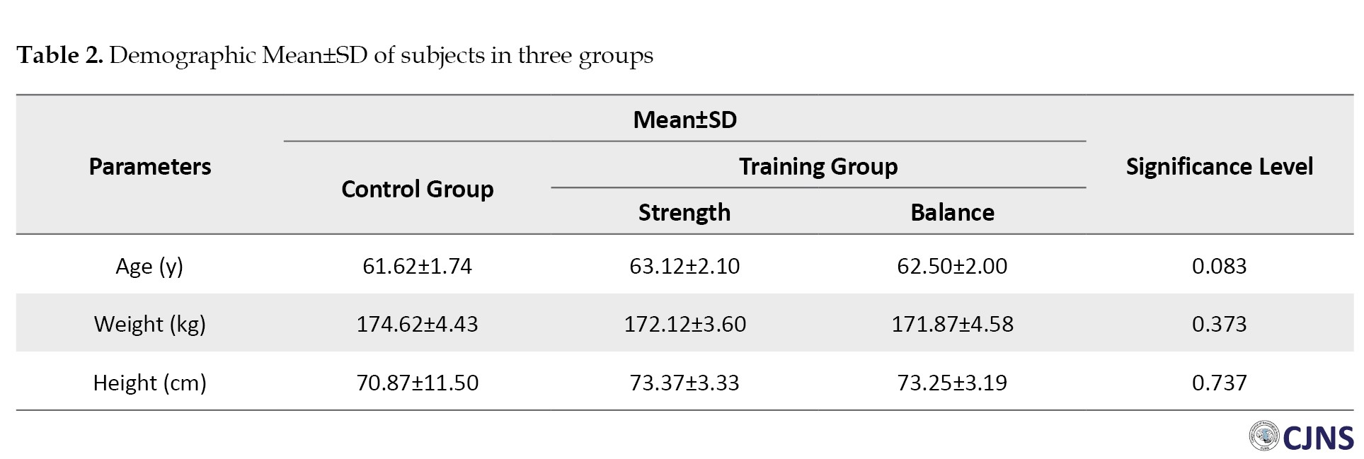 Considering the application of the intervention variable (strength and balance training) and the random selection of the participants from society, the current research was quasi-experimental in terms of method and strategy. In terms of the topic, research was applied with a pre-test-post-test design. Participants in this study were randomly assigned into 3 parallel arms, including the balance training group (n=12), strength training group (n=12), and control group (n=12). The control group did not engage in any exercise or training programs and continued with their regular daily activities. The statistical population of this research consisted of healthy older people from Tehran City, Iran, within an age range of 60 to 75 years. The results of similar previous studies [