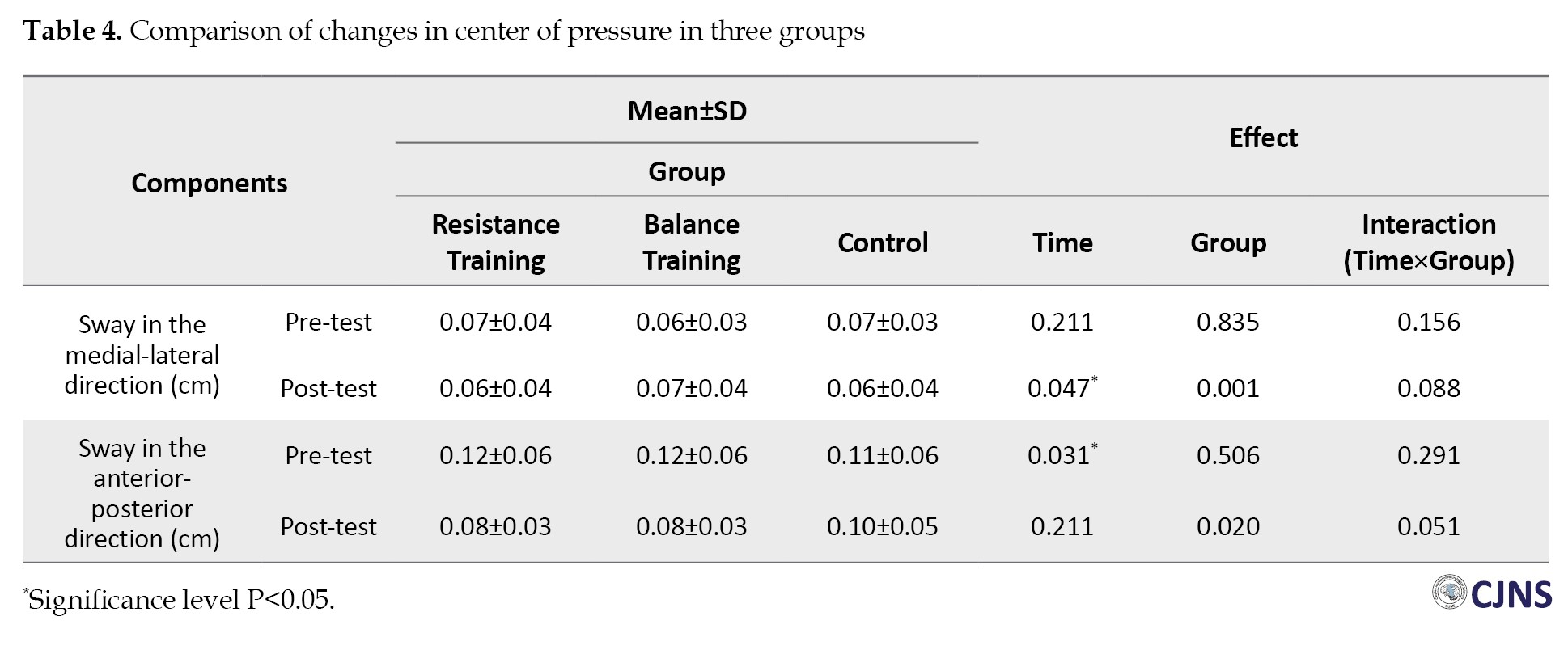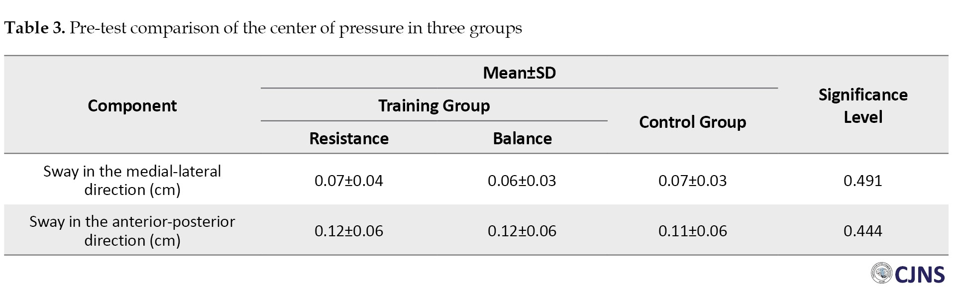 The results showed no statistically significant difference between the subjects’ average height, weight and age in the three groups. According to the obtained results, none of the components of the center of pressure in the pre-test stage between the three groups were significant (P<0.05) (