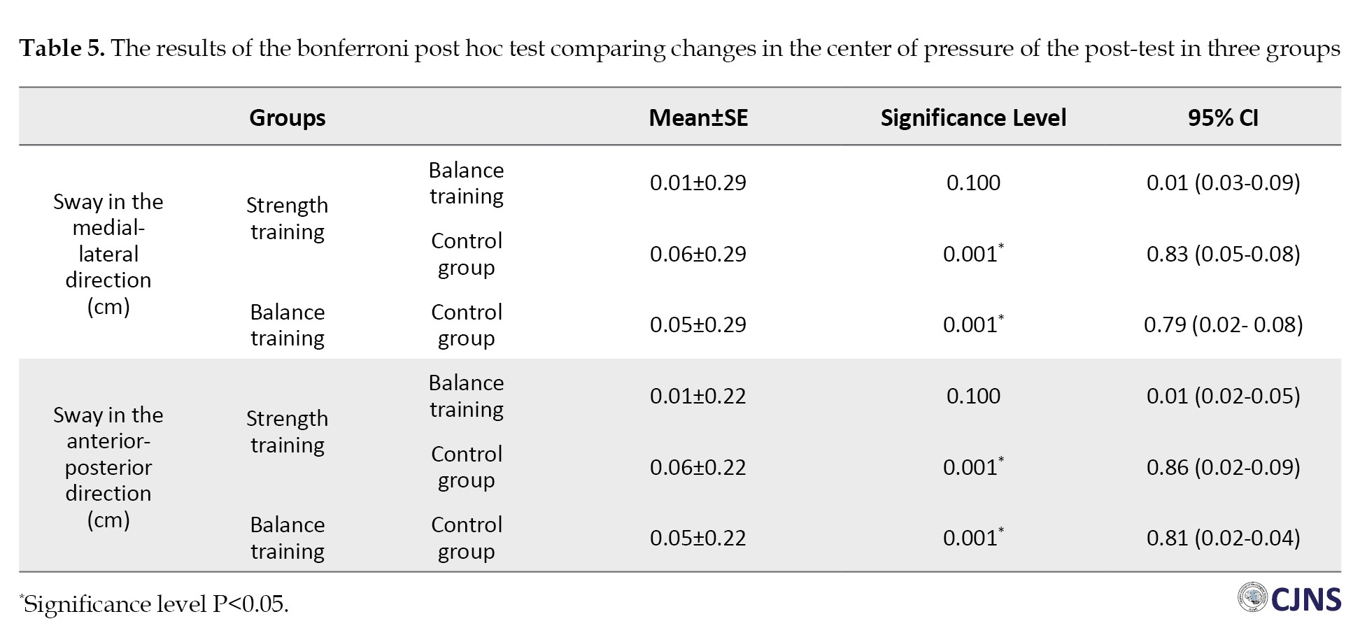 Table 5, the Bonferroni post hoc test shows a significant difference in the average sways in the medial-lateral and AP directions between the balance and strength exercises-control groups in the post-test.