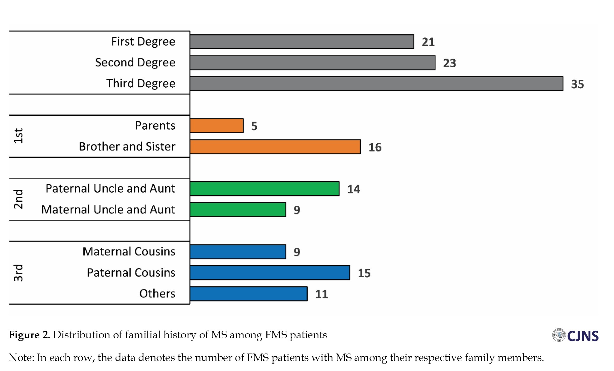Within the FMS group, 21 individuals (26.5%) exhibited a familial predisposition to MS among their first-degree relatives, 23(29.1%) among second-degree relatives, and 35(44.4%) among third-degree relatives (