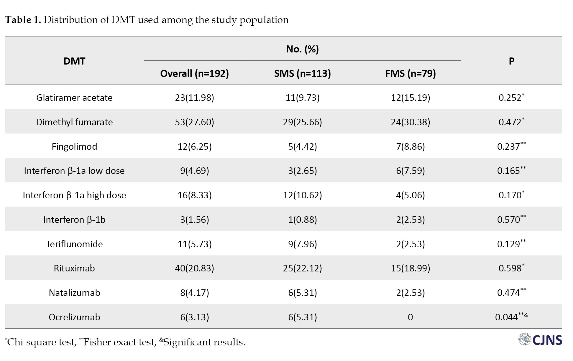 This study assessed 192 MS patients consisting of 79 FMS (41.1%) and 113 SMS (58.9%) patients. Patients were approximately matched in terms of DMTs utilization, except for ocrelizumab, which exhibited a statistically significant elevation in the SMS group (