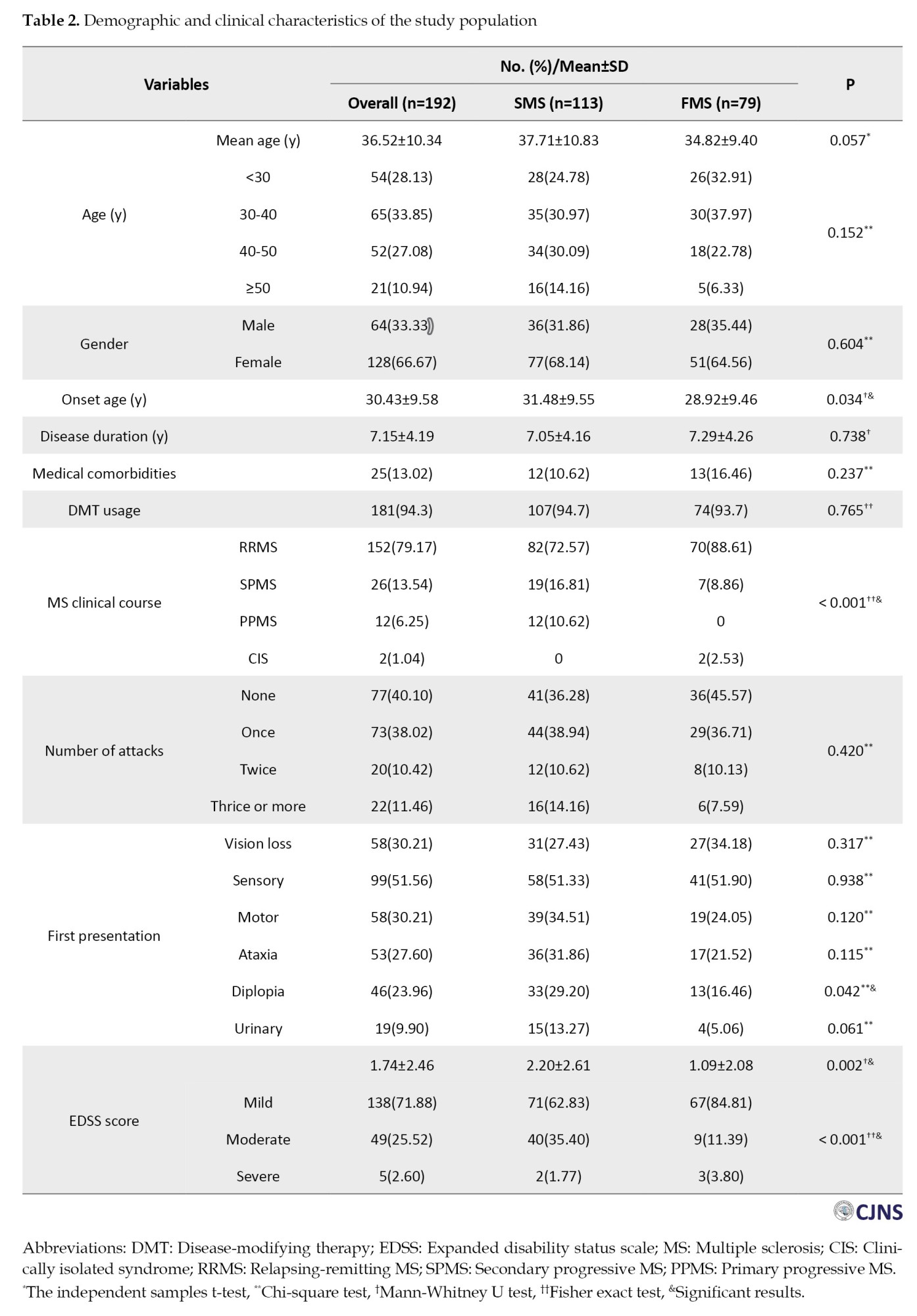 The average score of EDSS was significantly higher in the SMS group (2.20±2.61) compared to the FMS group (1.09±2.08, P=0.002). Interestingly, most patients in both groups showed mild EDSS scores (SMS: 62.8% vs FMS: 84.8%) (