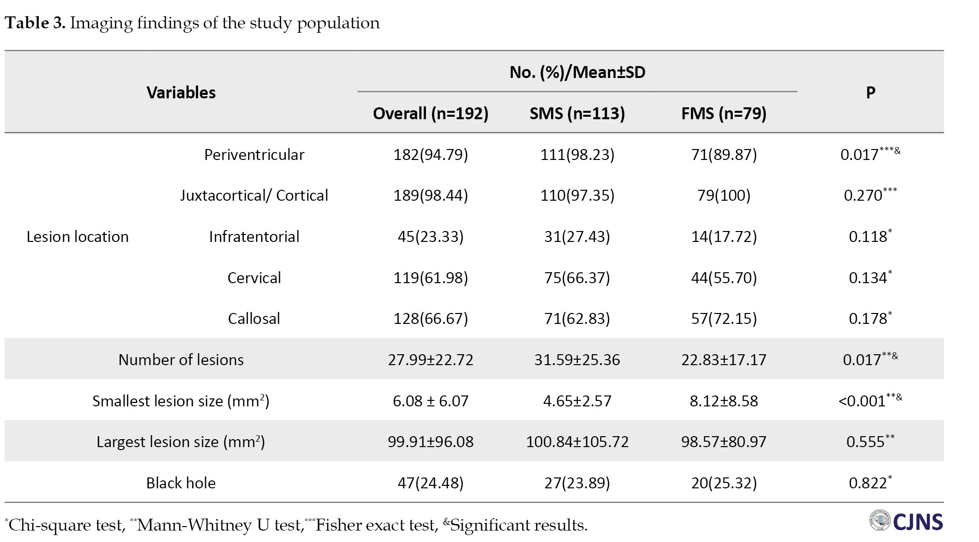 The frequency of lesions in the periventricular region was significantly higher in the SMS group (98.2%) compared to the FMS group (89.8%, P=0.017). However, no statistically significant difference was observed in juxtacortical/cortical (P=0.27), infratentorial (P=0.118), cervical (P=0.134) and callosal (P=0.178) regions between the two groups (