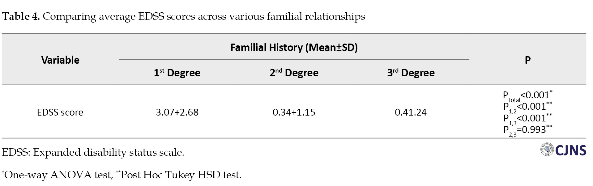 Table 2). Moreover, when comparing EDSS scores among different degrees of relatives, those in the first degree exhibited significantly higher scores (3.07±2.68) than second-degree (0.34±1.15) and third-degree (0.4±1.24, P1,2<0.001, P1,3<0.001, P2,3=0.993) relatives (