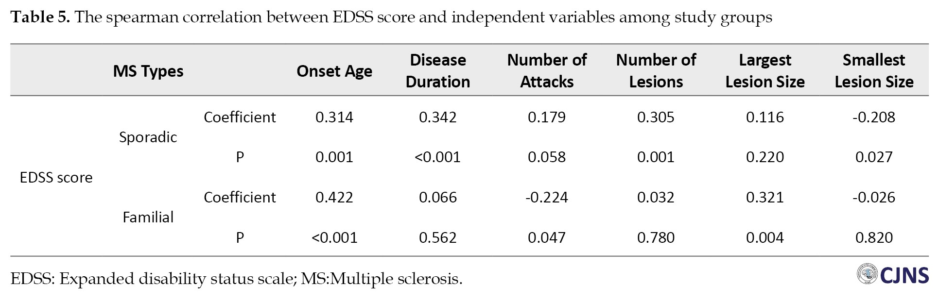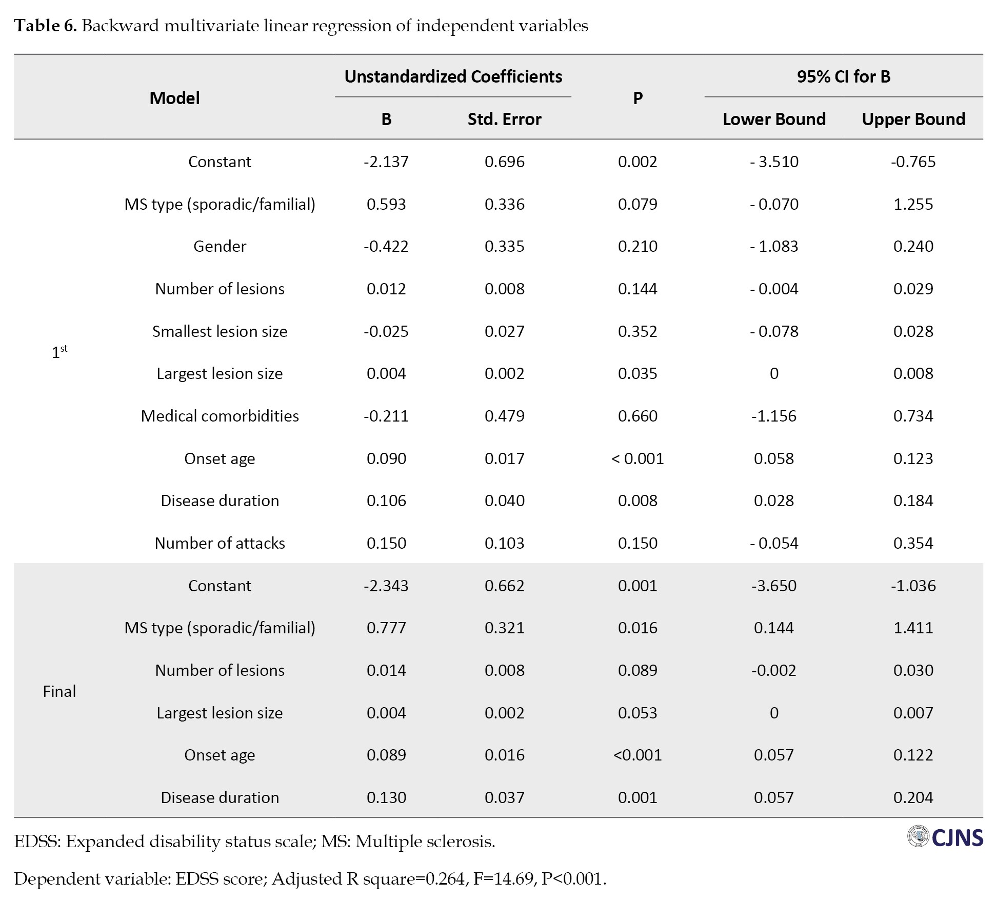 Multivariate linear regression analysis revealed that, collectively, the type of MS (SMS or FMS), number of lesions, largest lesion size, onset age and disease duration accounted for approximately 26.4% of the variability observed in the EDSS score (P<0.001). Notably, the final model underscored significant associations between the type of MS (FMS or SMS) (β=0.78, P=0.016), onset age (β=0.09, P<0.001) and disease duration (β=0.13, P=0.001) with the EDSS score (