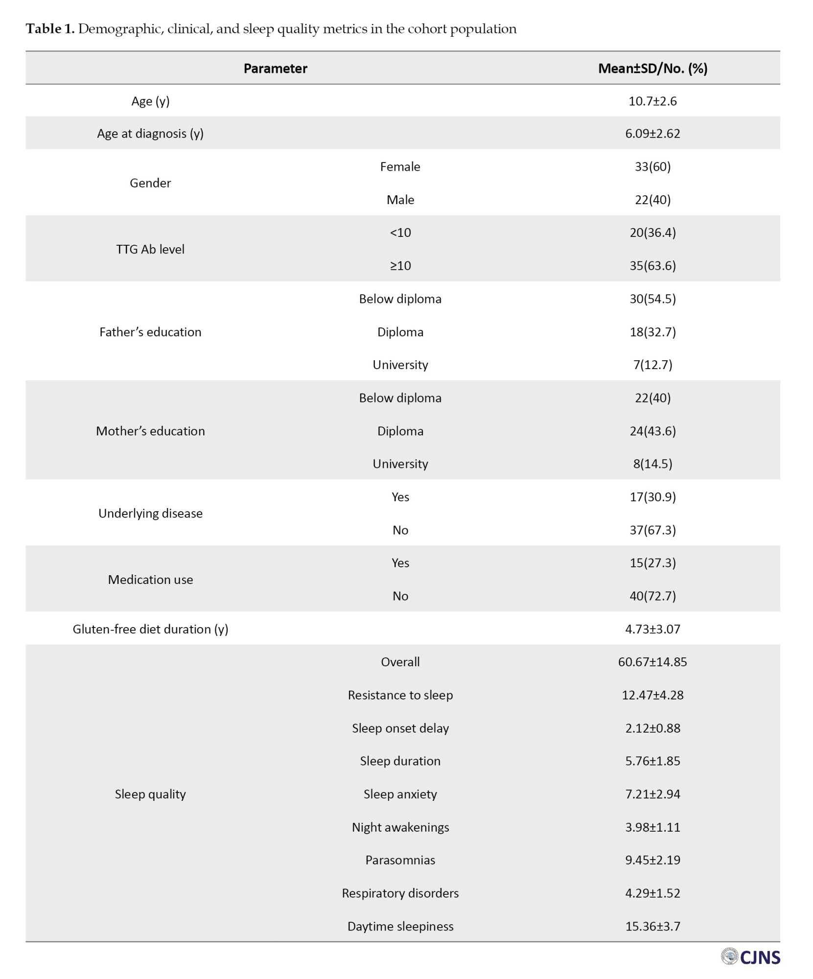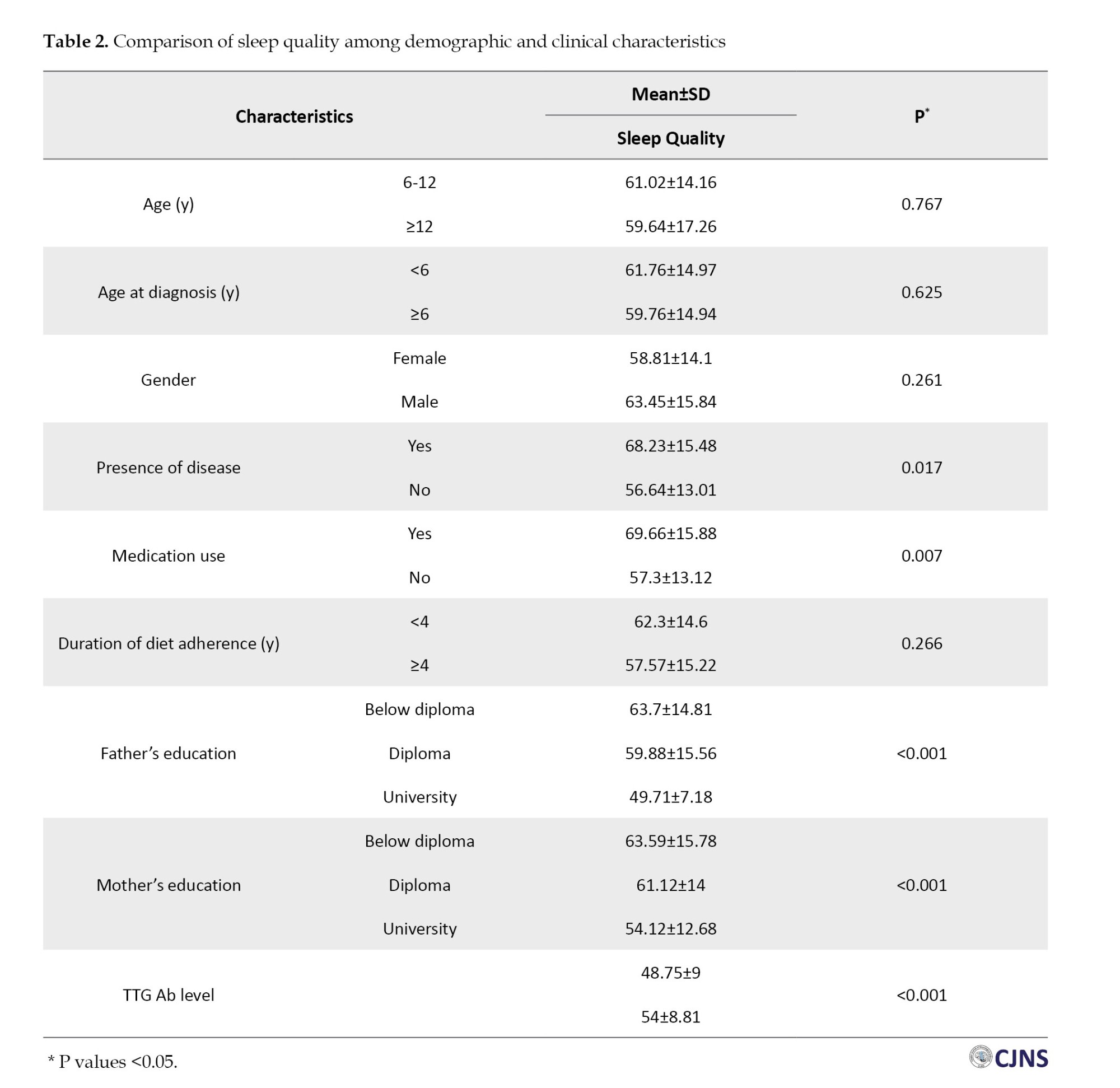 Data were collected after obtaining ethical clearance and identifying patients who met the inclusion criteria from the Yazd celiac system records. An online questionnaire was sent to the participants, who were requested to answer carefully. Two types of questionnaires were used: 1) Demographic information questionnaire including relevant information such as age, gender, age at diagnosis, the serum level of TTG Ab, medication use, gluten-free diet duration, and parents’ education, and 2) Children’s sleep habits questionnaire (CSHQ). This study used the Persian version of parent-reported CSHQ. It consists of 45 questions, of which only 33 are considered for scoring. Eight subscales of CSHQ were measured: Bedtime resistance, sleep onset delay, sleep duration, sleep anxiety, night waking, parasomnias, daytime sleepiness, and sleep-disordered breathing. Each item is scored between 1 and 3 (“rarely” to “usually”), except for specific reverse-scored items. The score range is 33-99. Sleep disturbances are defined by a score of 41 [13]. Fallahzadeh et al. evaluated the validity and reliability of the Persian version of CSHQ using the Cronbach α coefficient. A Cronbach α coefficient of 0.80 was calculated for the entire questionnaire. There was a range of convergence validity of 0.4 to 0.86 [13].