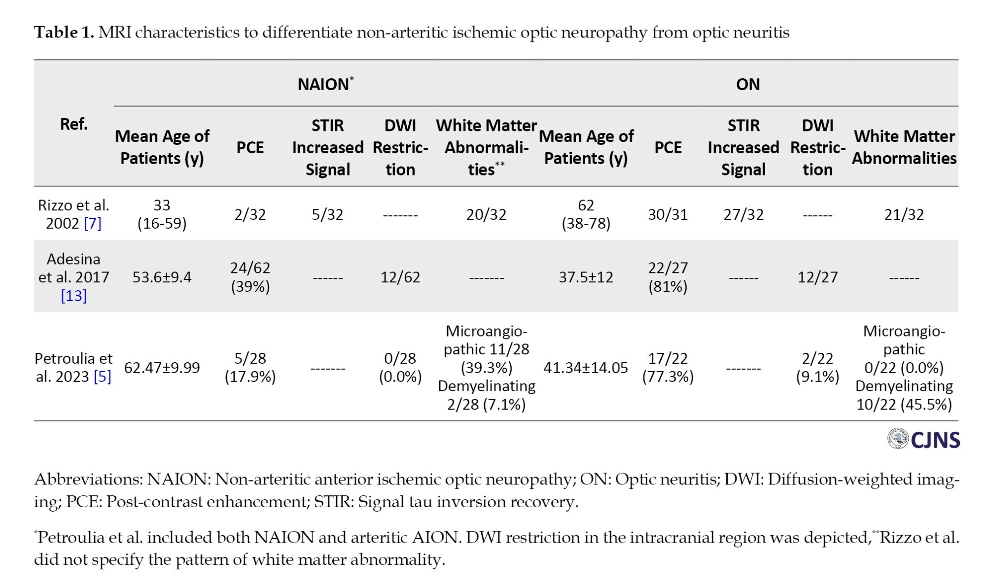 Early differentiation between the two entities is critical for effective management, prognosis, and future treatment planning. Despite advances in MRI techniques and well-described MRI characteristics of ON, its role in NAION has been less considered. MRI criteria for differentiating one from the other have not been described in the medical literature.