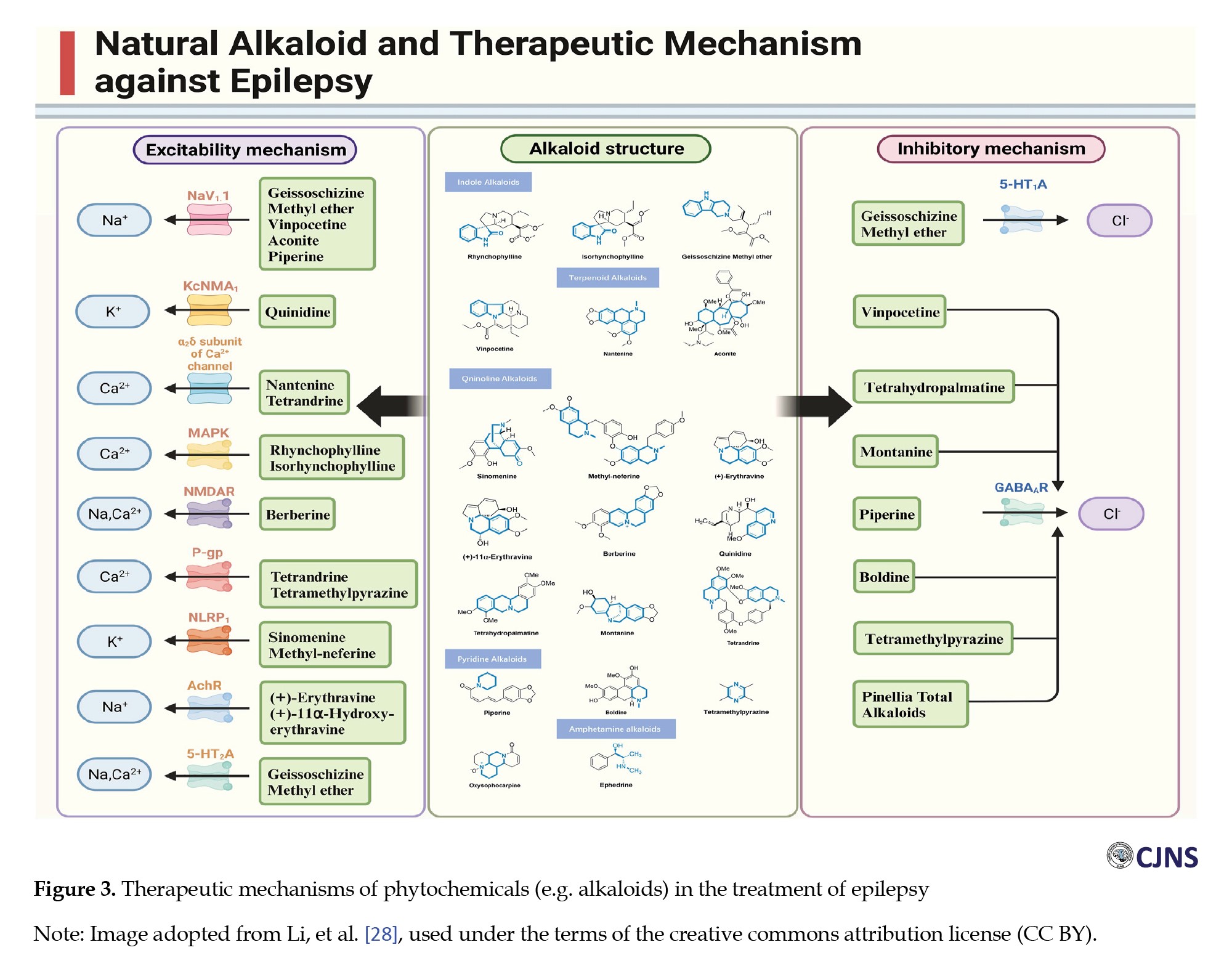 - Li S, Lin X, Duan L. Harnessing the power of natural alkaloids: The emergent role in epilepsy therapy. Front Pharmacol. 2024; 15:1418555. [DOI:10.3389/fphar.2024.1418555] [PMID]