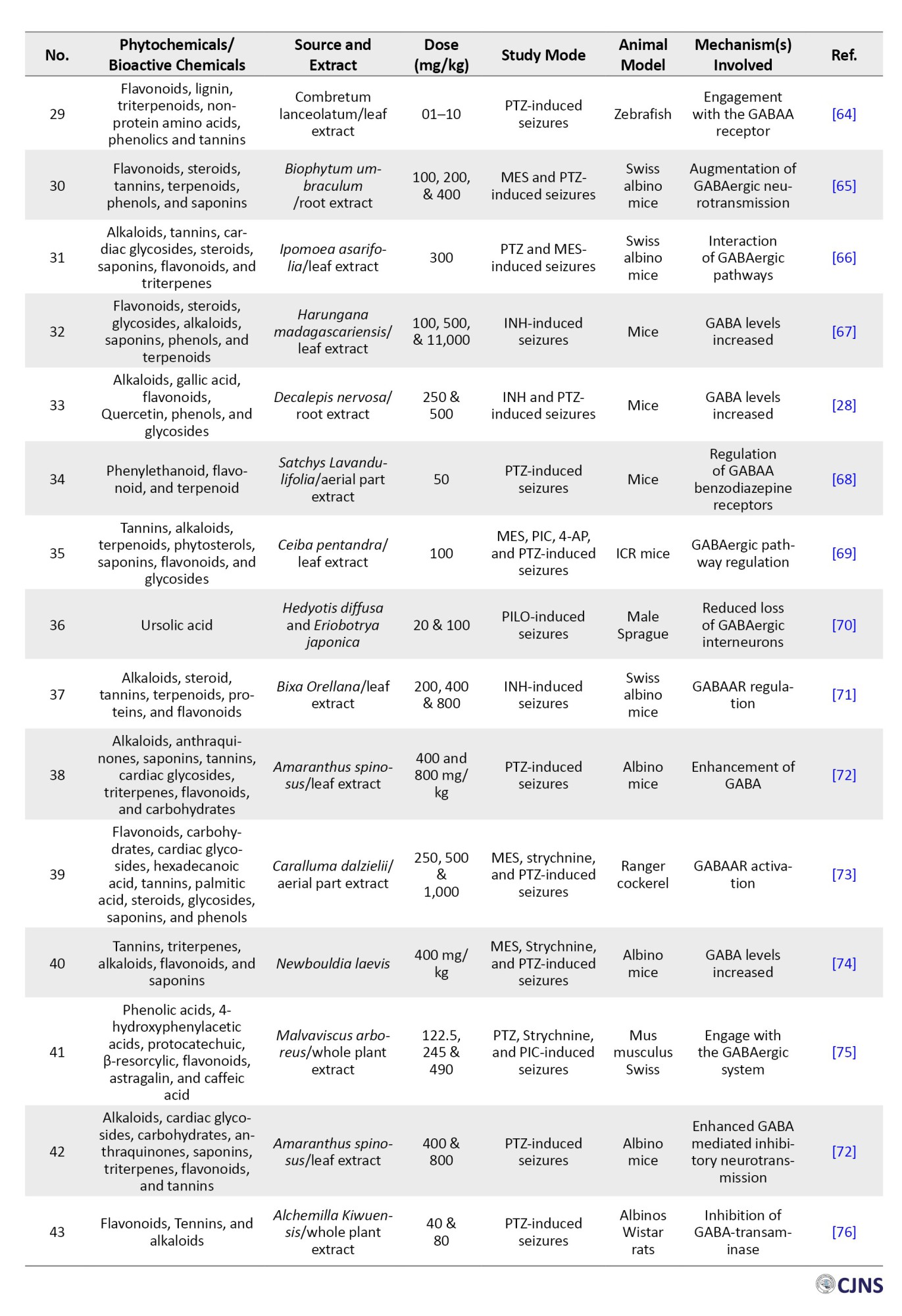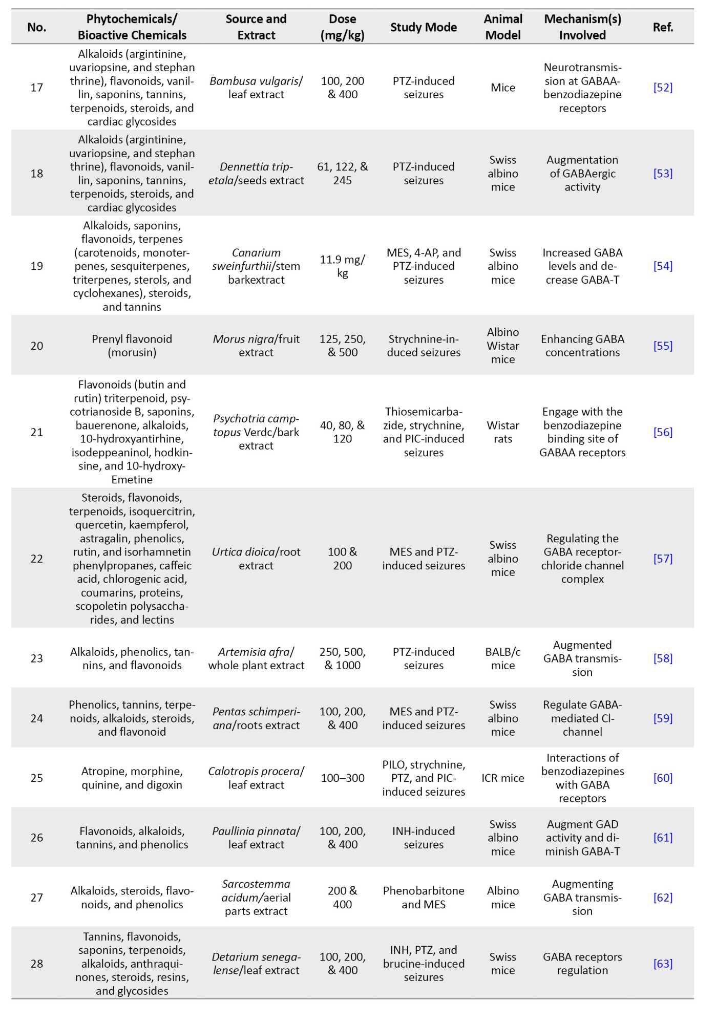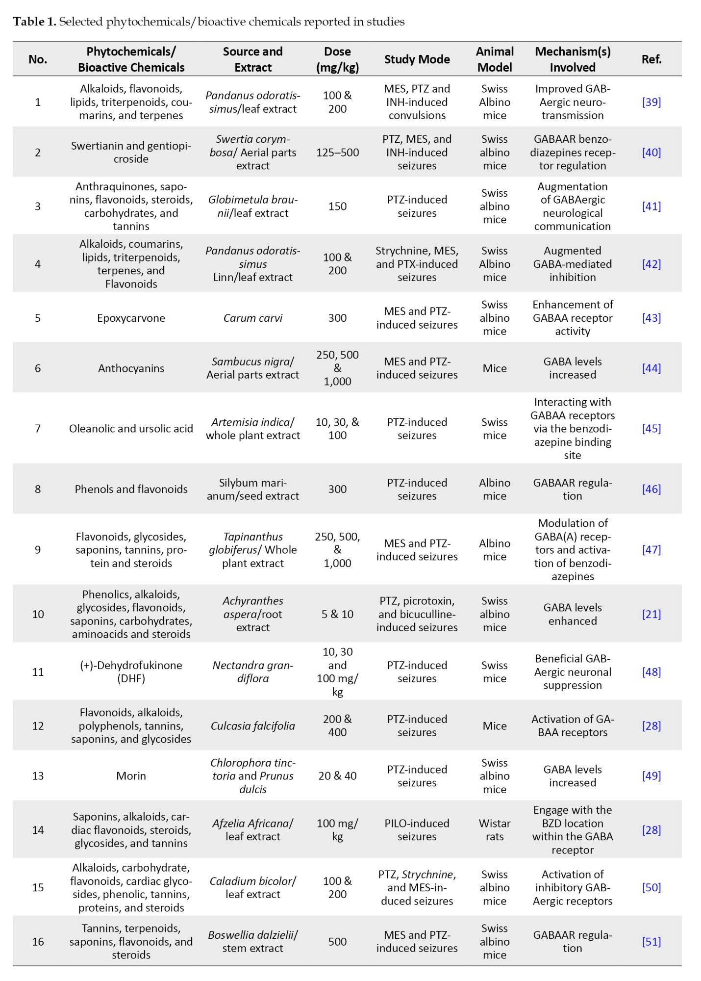 Table 1 presents plant-based phytochemicals reported recently (2014-2024) with antiepileptic activity through various mechanisms studied by in-vitro and in-vivo studied.
